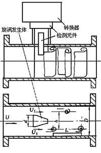 在流體中設(shè)置旋渦發(fā)生體(阻流體),從旋渦發(fā)生體兩側(cè)交替地產(chǎn)生有規(guī)則的旋渦,這種旋渦稱為卡曼渦街(見(jiàn)圖1),旋渦列在旋渦發(fā)生體下游非對(duì)稱地排列。根據(jù)卡曼渦街原理,有如下關(guān)系式: