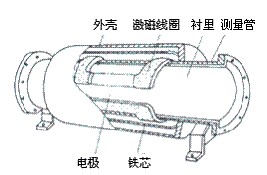 防腐型電磁流量計由傳感器和轉(zhuǎn)換器組成。而傳感器主要組成部分是:測量管、電極、勵磁線圈、鐵芯與磁軛殼體。傳感器安裝在測量管道上,轉(zhuǎn)換器可以與傳感器組合連接在一起稱為一體型電磁流量計,轉(zhuǎn)換器被安裝在離傳感器30米內(nèi)或100米內(nèi)的場合,兩者間由屏蔽電纜連接稱為分體式電磁流計。