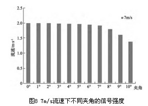 通過仿真模擬,圖4給出流速u=5m/s時(shí),作用在三角柱上的升力系數(shù)和阻力系數(shù)變化曲線。由圖5升力系數(shù)的FFT曲線可以看出其頻率為FL=87.92Hz。從圖6阻力系數(shù)的FFT曲線可以看出其頻率為FD=176.43Hz,約為升力系數(shù)變化頻率的2倍。 為了驗(yàn)證將FLUENT用于渦街流量計(jì)的三維流場(chǎng)仿真的可行性,對(duì)不同流速下的升、阻力頻率進(jìn)行比較,如表1所示。可以看出阻力系數(shù)變化頻率是升力系數(shù)變化頻率的2倍,說明用FLUENT進(jìn)行渦街流量計(jì)的三維仿真是可行的。 4 仿真結(jié)果 基于上述通過升、阻力變化頻率的關(guān)系驗(yàn)證出利用FLUENT對(duì)三維渦街流場(chǎng)進(jìn)行仿真是可行的。本節(jié)應(yīng)用FLUENT對(duì)截流夾角、流速和信號(hào)強(qiáng)度之間的關(guān)系進(jìn)行了仿真研究。分別取7m/s、40m/s和70m/s的流速α的角度在0°~10°范圍內(nèi)取值(發(fā)生體的安裝偏差一般不會(huì)超過10°),進(jìn)行數(shù)值仿真。記錄信號(hào)強(qiáng)度,如表2所示。 將表2的數(shù)據(jù)繪制成圖7,將圖7中流速為7m/s的數(shù)據(jù)放大如圖8所示。觀察圖7、8,可以直觀的反應(yīng)出夾角、流速與信號(hào)強(qiáng)度的關(guān)系變化。通過對(duì)比這3張圖可以看出,信號(hào)強(qiáng)度隨著夾角、流速的不同而不同。并從圖中得出結(jié)論: 1)渦街的信號(hào)強(qiáng)度與流速成正比,隨著流速的增加,旋渦脫落頻率信號(hào)強(qiáng)度會(huì)顯著增加。 2)在流速相同的情況下,隨著夾角的增大,信號(hào)強(qiáng)度逐漸減小,并隨著夾角的增大,信號(hào)強(qiáng)度的衰減程度也逐漸增大。夾角在1°~7°范圍,對(duì)信號(hào)強(qiáng)度的衰減影響不大,可忽略,超過7°以后對(duì)信號(hào)強(qiáng)度影響變大,不可忽略。 3)在夾角相同的情況下,隨著流速的增大,信號(hào)強(qiáng)度衰減趨勢(shì)越來越明顯。 5 結(jié)論 流場(chǎng)仿真在渦街流量計(jì)的設(shè)計(jì)和完善中正變得越來越重要,它通過理論支持指導(dǎo)仿真的可實(shí)施性,并將仿真結(jié)論用于實(shí)驗(yàn)中,提高效率。通過模擬三維渦街流場(chǎng)三角柱繞流現(xiàn)象,將升、阻力頻率進(jìn)行對(duì)比,驗(yàn)證了可將FLUENT用于三維渦街流場(chǎng)的仿真中。并從不同流速和不同截流夾角兩方面分別考慮,對(duì)比分析了三維渦街信號(hào)的信號(hào)強(qiáng)度,得出夾角在1°~7°范圍,對(duì)信號(hào)強(qiáng)度的影響不大,超過了7°以后影響變大。從而為以后的實(shí)驗(yàn)做出理論指導(dǎo)。進(jìn)一步的研究可以通過對(duì)不同形狀的旋渦發(fā)生體取不同截流夾角和不同流速進(jìn)行仿真對(duì)比研究。