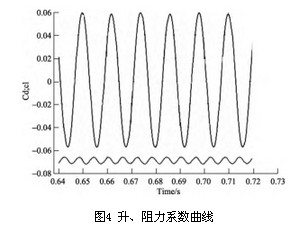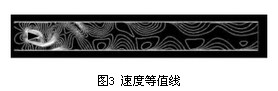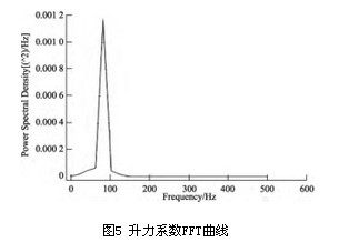 3.2 仿真參數(shù)設(shè)置 在FLUENT中,三維渦街流場(chǎng)參數(shù)設(shè)置如下: 1)流體:空氣(air); 2)湍流模型:Renormalization-group(RNG)k-ε模型; 3)邊界條件 ①流速入口邊界:根據(jù)需要設(shè)置不同流速、湍流動(dòng)能和耗散率; ②壓力出口邊界:零壓; 4)求解器:基于壓力的三維雙精度瞬態(tài)求解器; 5)數(shù)值計(jì)算過程:SIMPLE算法。 3.3 升、阻力變化頻率的計(jì)算結(jié)果及分析 圖3所示速度等值。三維渦街流場(chǎng)在夾角為0°,入口流速為5m/s的情況下的速度等值線圖。