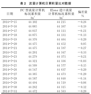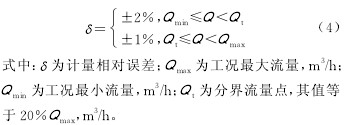 天然氣作為一種高效清潔能源,其需求量隨著全球低碳經(jīng)濟(jì)的發(fā)展呈現(xiàn)快速增長(zhǎng)趨勢(shì),預(yù)計(jì)2020 年國(guó)內(nèi)天然氣需求量將達(dá) 3 000×108m3[1-4]。進(jìn)口渦輪流量計(jì)一直占據(jù)著高壓管道貿(mào)易計(jì)量市場(chǎng),而國(guó)產(chǎn)渦輪流量計(jì)通常應(yīng)用于低壓管道,用戶主要為城市燃?xì)獾墓I(yè)用戶。 隨著工業(yè)過程控制自動(dòng)化的實(shí)施及輸氣管道的大量建設(shè),對(duì)貿(mào)易計(jì)量所需的渦輪流量計(jì)和具有強(qiáng)大功能的流量計(jì)算機(jī)的需求量也不斷增大,因此,擁有自主知識(shí)產(chǎn)權(quán)且滿足工業(yè)性應(yīng)用要求的精度好的高壓渦輪流量計(jì)與流量計(jì)算機(jī),對(duì)實(shí)現(xiàn)管道設(shè)備的國(guó)產(chǎn)化,打破國(guó)外技術(shù)壟斷,保障管道安全、經(jīng)濟(jì)、高效運(yùn)行,具有十分重要的意義。為了評(píng)價(jià)國(guó)產(chǎn)化流量計(jì)在實(shí)際運(yùn)行過程中的準(zhǔn)確度、可重復(fù)性、穩(wěn)定性及安全性等指標(biāo),為后續(xù)新建管道的推廣應(yīng)用及流量計(jì)的制造、改進(jìn)提供依據(jù),對(duì) 4 臺(tái)國(guó)產(chǎn) 氣體高壓渦輪流量計(jì)和FC 型流量計(jì)算機(jī)進(jìn)行了現(xiàn)場(chǎng)工業(yè)性試驗(yàn)。 1 高壓氣體渦輪流量計(jì) 1.1 工作原理 高壓氣體渦輪流量計(jì)是一種帶機(jī)械計(jì)數(shù)器并用于準(zhǔn)確測(cè)量氣體流量的流量計(jì),其工作原理:當(dāng)高壓氣流進(jìn)入流量計(jì)時(shí),首先經(jīng)過整流器整流并加速,在流體的作用下,渦輪克服阻力矩開始轉(zhuǎn)動(dòng);當(dāng)力矩達(dá)到平衡時(shí),渦輪轉(zhuǎn)速穩(wěn)定,此時(shí)其轉(zhuǎn)速與氣體工況流量成正比,并通過齒輪減速傳動(dòng);磁耦合聯(lián)接驅(qū)動(dòng)字輪計(jì)數(shù)器轉(zhuǎn)動(dòng),直接累積氣體的工況體積總量。 因?yàn)橥ㄟ^渦輪的流量與渦輪轉(zhuǎn)速成正比,所以高頻信號(hào)脈沖輸出頻率與渦輪轉(zhuǎn)速存在以下關(guān)系[7]: 綜上所述,儀表系數(shù)K 除與渦輪導(dǎo)程、葉片數(shù)、葉片寬度、螺旋升角、流量計(jì)流體通道等結(jié)構(gòu)因素有關(guān)外,還與介質(zhì)流體黏性、軸承本身阻尼、軸承潤(rùn)滑油黏度等有關(guān),若以上其中一種或幾種相關(guān)因素發(fā)生改變,則儀表系數(shù)K 也會(huì)相應(yīng)改變,因此流量計(jì)應(yīng)通過線性檢定等試驗(yàn)方式進(jìn)行最終設(shè)計(jì)確認(rèn)。 1.2 性能測(cè)試 以 EN 12261-2002《Gas meters - Turbine gasmeters》[8]和 OIML R137-1-2006《氣體流量計(jì)》作為流量計(jì)產(chǎn)品的研制依據(jù),并嚴(yán)格按照標(biāo)準(zhǔn)進(jìn)行性能測(cè)試,主要包括:耐久性試驗(yàn)、彎矩與扭矩試驗(yàn)、短時(shí)過載試驗(yàn)、擾動(dòng)試驗(yàn)以及高低溫性能測(cè)試等。 1.2.1 耐久性測(cè)試 渦輪流量計(jì)進(jìn)行耐久性測(cè)試的目的在于確認(rèn)流量計(jì)在指定條件下的計(jì)量性能是否符合分段要求[9],即: 確認(rèn)各種安裝位置是否影響測(cè)試樣機(jī)的計(jì)量性能,安裝位置可分為水平方向、垂直向上與垂直向下。在不同安裝位置情況下,樣機(jī)在耐久性測(cè)試前后指示誤差的變化量不得超過式(4)要求值的 1/3。 以 DN80-G100 樣機(jī)為例,進(jìn)行耐久性測(cè)試說明。首先將 3 臺(tái)樣機(jī)分別安裝在同一管道的不同位置,管道內(nèi) 0.8 MPa 壓縮氣體以樣機(jī)最大流量進(jìn)行循環(huán)運(yùn)行,以每 1 000 h 為運(yùn)行單位,將樣機(jī)拆卸并在標(biāo)準(zhǔn)氣體流量裝置上進(jìn)行相應(yīng)性能測(cè)試,得到 7 000 h 運(yùn)行測(cè)試數(shù)據(jù)(圖 1)。 結(jié)果表明:該測(cè)試樣機(jī)滿足耐久性測(cè)試要求,指示誤差的變化量未超過最大允許誤差的 1/3;軸承經(jīng)過長(zhǎng)時(shí)間運(yùn)行磨合更趨于穩(wěn)定,長(zhǎng)期運(yùn)行后非線性段更趨于理想特性曲線。 1.2.2 彎扭矩測(cè)試 對(duì)于高壓渦輪流量計(jì),應(yīng)該詳細(xì)說明流量計(jì)所需的彎曲與扭力力矩的保護(hù)水平[2]。該數(shù)據(jù)可以通過試驗(yàn)直接獲得(圖 2,其中直管段 1 連接氣體流量標(biāo)準(zhǔn)裝置,圖 2a 中在直管段 2 預(yù)先確定的力臂L 位置附加垂直方向的力F 而形成彎矩M;圖 2b 中在直管段 2 側(cè)面預(yù)先確定的力臂L 位置附加垂直方向的力F 而形成扭矩T,而彎矩與扭矩均是作用于流量計(jì)入口與出口法蘭處)。由于該項(xiàng)測(cè)試主要是針對(duì)流量計(jì)強(qiáng)度的校核,為了使測(cè)試結(jié)果更具說服力,并且提高其可靠性,將鋁合金殼體的中低壓渦輪流量計(jì) DN80-G100 用于此次測(cè)試。測(cè)試過程中按照 EN 12261-2002 表 10中要求施加 1 倍、2 倍直至 4 倍(即力矩為 3 040 N·m)的砝碼F,未發(fā)現(xiàn)流量計(jì)殼體有任何異常變化。施加砝碼F 時(shí)及卸下砝碼之后得到的指示誤差與施加砝碼F 之前的指示誤差無明顯變化,實(shí)際變化量均在最大允許誤差的 1/3 以內(nèi)。 1.2.3 常壓與高壓試驗(yàn)對(duì)比 為了確認(rèn)高壓渦輪流量計(jì)在高壓氣體介質(zhì)中計(jì)量性能是否滿足工業(yè)貿(mào)易計(jì)量要求,將多臺(tái) DN80-G160樣機(jī)發(fā)往國(guó)家石油