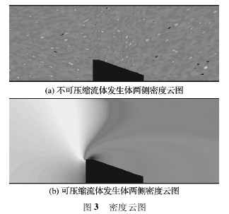 根據公式 ( 1) 可知,影響渦街流量計旋渦頻率的是發(fā)生體兩側的流速 U1和發(fā)生體的結構,由于發(fā)生體結構尺寸是固定的,因此頻率只與 U1相關,需要觀測在相同入口流速 U 的條件下 U1變化來得到頻率的變化,而速度的變化必然會導致流體密度的變化,因此可觀測發(fā)生體兩側的密度云圖,來判斷可壓縮性對渦街流量計流速 U1的影響,通過仿真得到如圖 3 ( a) 所示的不可壓縮流體發(fā)生體兩側的密度云圖和如圖 3 ( b) 所示的可壓縮流體發(fā)生體兩側的密度云圖。