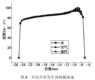 根據圖 3 得到的結論,對渦街流量計進行蒸汽、空氣和水三種介質下的軟件仿真,設置三種介質的入口流速均為 50 m/s,取渦街發(fā)生體迎流面?zhèn)壤庵悬c與管壁連線,如圖 2 中線段 ab所示。取該線上的速度值,將蒸汽、空氣和水三種介質下的速度曲線進行比較,結果如圖 4所示。