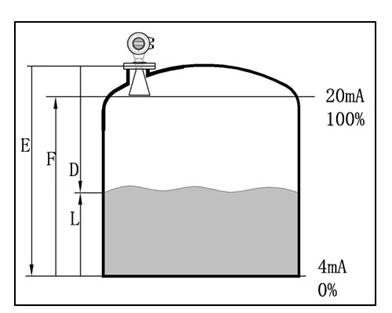 通過(guò)輸入空罐高度E(=零點(diǎn)),滿罐高度F(=滿量程)及一些應(yīng)用參數(shù)來(lái)設(shè)定,應(yīng)用參數(shù)將自動(dòng)使儀表適應(yīng)測(cè)量環(huán)境。對(duì)應(yīng)于4-20mA輸出。 |
