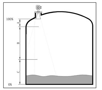 - 若介質(zhì)為低介電常數(shù)當(dāng)其處于低液位時(shí),罐低可見(jiàn),此時(shí)為保證測(cè)量精度,建議將零點(diǎn)定在低高度為C 的位置。