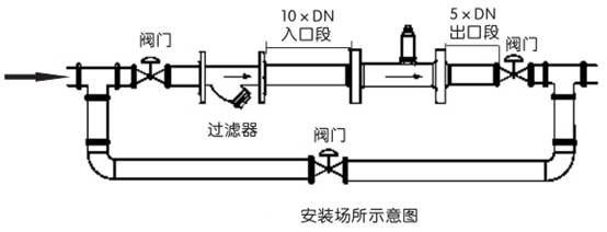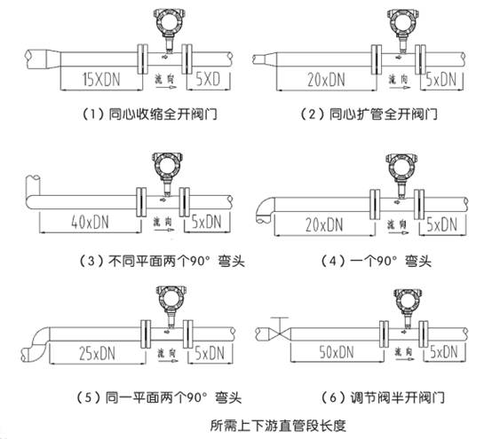 渦輪流量計(jì)對(duì)管道內(nèi)流速分布畸變及旋轉(zhuǎn)流是敏感的,進(jìn)入傳感器應(yīng)為充分發(fā)展湍流,因此要根據(jù)傳感器上游側(cè)阻流件類型配備必要的直管段或整流器,要求入口段和出口段直管段長度。