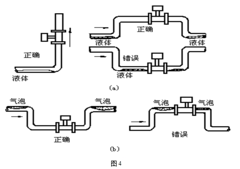 d)測量液體時,為了保證管內(nèi)充滿液體,所以在垂直或傾斜管道安裝儀表時,應(yīng)該保證液體流動方向從下而上。若管道內(nèi)含少量氣體,為了防止氣體進入儀表測量管,儀表應(yīng)安裝在管線的較低處如圖4b所示