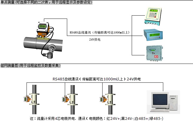 一次表與二次表(或計(jì)算機(jī))之間采用RS-485總線通訊,采用普通電纜即可,傳輸距離可達(dá)1000米以上,組網(wǎng)十分方便、快捷。這種傳輸方式抗干擾能力佳,解決了分體式超聲波流量計(jì)專用電纜成本高、抗干擾能力差、傳輸距離短等問題。